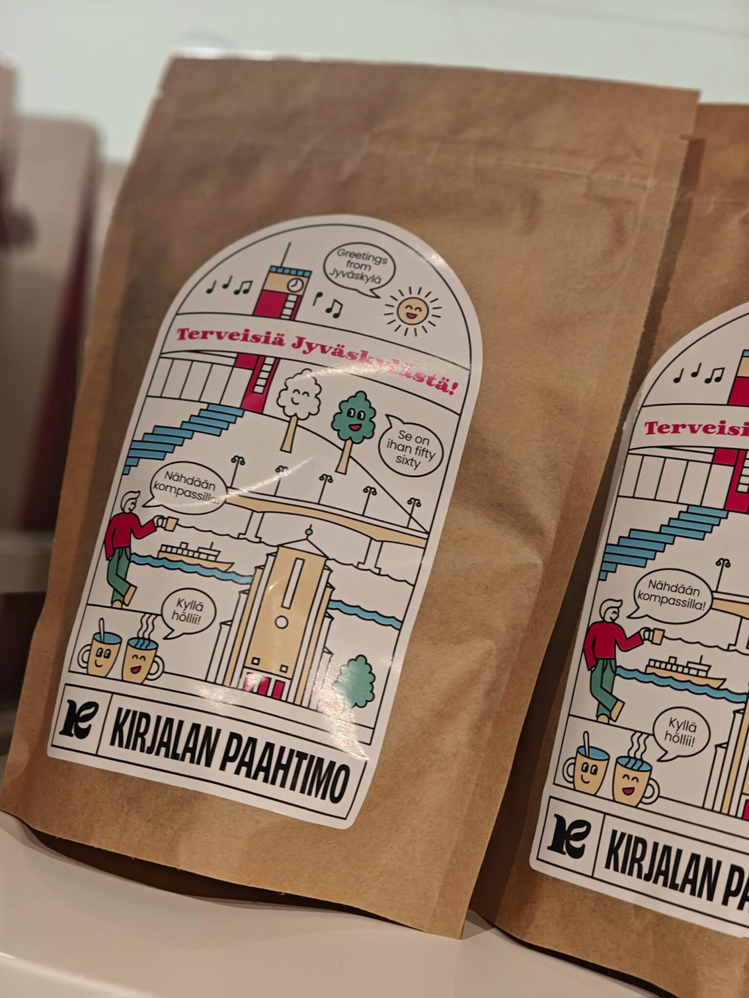 Kahvin paahtaa ja etiketöi mikkeliläinen Kirjalan Kahvipaahtimo. Perheyrityksessä isä Olli paahtaa ja lapset Anna ja Väinö hoitavat myyntihommat. Kirjala on tunnettu erittäin korkealaatuisista kahveistaan, joita arvostetaan myös baristojen keskuudessa. Oli ilo saada mukaan pala Mikkeliä myös Jyväskylään.